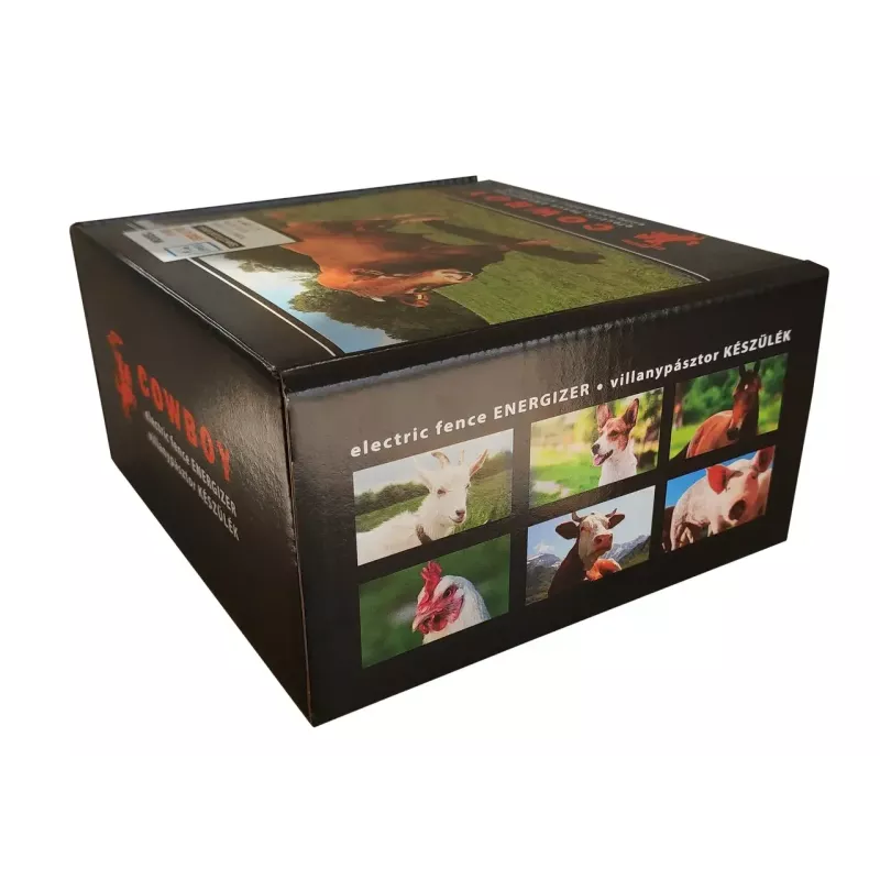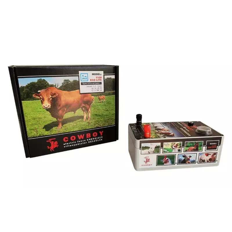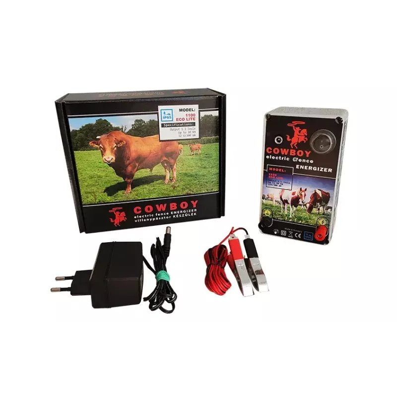 Пристрій підходить для Корів, Коней, Птахи, Кіз, Собак, Свиней. Максимальна довжина паркану, що рекомендується, становить 20 км без рослинності. Для забезпечення хорошої провідності рекомендується використовувати заземлення від 80 до 120 см. Пристрій поставляється з чітким керівництвом та відповідає всім європейським стандартам. Cowboy 1100 eco lite виробляється в Угорщині з гарантією 12 місяців.